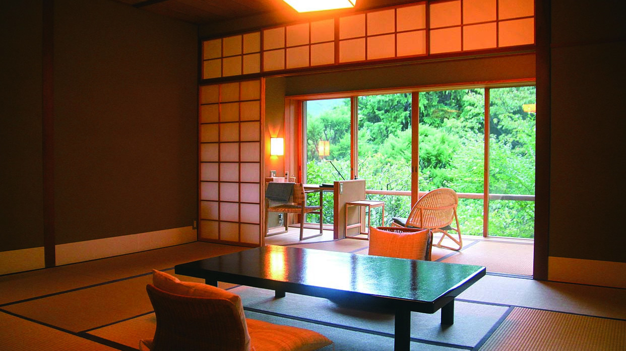 石葉は小高い若草山山中の木々に包まれ静謐に佇みます。数寄屋造りの建物は民家の大らかさも取り入れ古き良き別荘の風情と洗練された空間です。客室は9部屋、それぞれに趣を変え地形を生かした野趣豊かな庭園越しに岩戸山を望みます、居住性を追求した客室は日本建築ならではの情緒に彩られ、鳥たちのさえずり、やさしい風が窓から入ります。