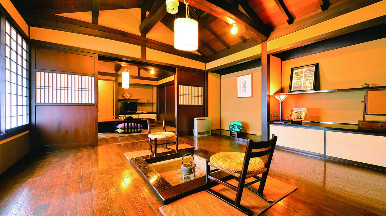 館内に入りますとロビーに松本民芸家具や西洋アンティークのモダンな雰囲気、冬に成りますと暖炉に火が入りオーディオが、静かにジャズを奏でてお迎えします。館内の至るところに、絵画、民芸品、お皿、オーディオ、おもちゃ等飾られ、パブリックスペースも、足湯、サロン、バー、ツリーハウスも、お楽しみください。